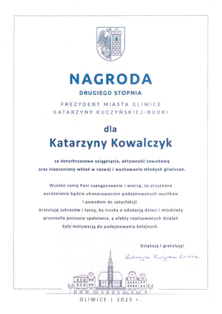i wychowawcze, została uhonorowana w dniu 14.10.2025r. podczas Gliwickiej Gali Oświatowej z okazji Dnia Edukacji Narodowej Nagrodą Prezydenta Miasta Gliwice.